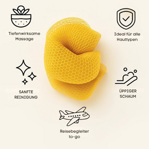 Die spezielle Netzstruktur mit Knoten reinigt auch schwer erreichbare Stellen wie Rücken oder Po effektiv und unterstützt die natürliche Regeneration der Haut. Ohne Chemie.